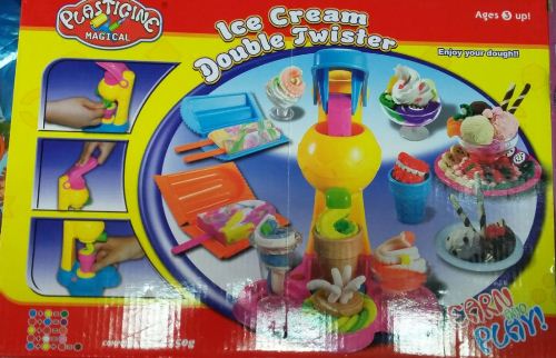 В комплекте ложечки, тарелочки, формы для мороженного, рожки для мороженного, скалочка, 5 баночек с магическим пластилином.
