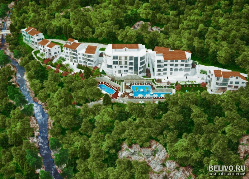 Местоположение Комплекса - его большой плюс. Комплекс не находится в густой городской застройке, а располагается на обособленной лесопарковой территории. По границе протекает горная речка , дающая прохладу в летнее время , она же источник резервного водоснабжения. Горная река заливается во все бассейны Комплекса. Вниз до моря и променада - 7 минут пешком. Вместе с тем, перейдя вбок по мосту через речку, сразу оказываешься в густом и совершенно не застроенном лесном массиве с бесконечными лесными дорожками. Массив не подлежит застройке. Если пойти в другую сторону от реки, то все магазины и прочая инфраструктура города также в пешеходной доступности.
