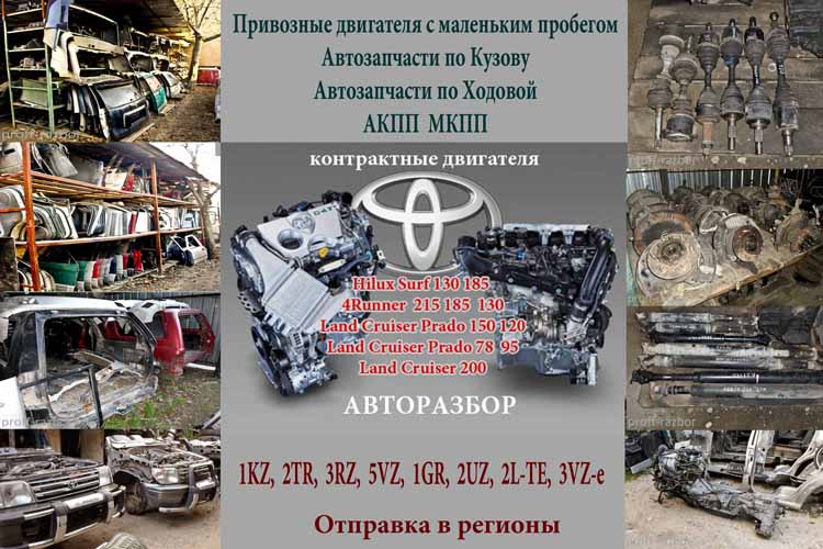 Двигателя с маленькими пробегами на Toyota Land Cruiser Prado 1990-2010 года выпуска (Тойота Лэнд Крузер Прадо) 150, 120, 95, 90, 78 в сборе и без навесного - 1KZ, 2TR, 3RZ, 5VZ, 1GR, 2UZ, 2L-TE, 3VZ-e. Запчасти по двигателю - головки блока, поршни, шкивы, форсунки, дроссельные заслонки и тд. Запчасти по ходовой - АКПП, МКПП, карданы, раздатки, приводы, мосты, полуоси, чулки, тормозные диски, суппорты, рулевые рейки, цапфы, ступицы, рычаги, пружины, амортизаторы, стабилизаторы и тд.