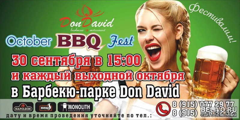 Вы можете купить входной билет на мероприятие и наслаждаться БЕСПЛАТНО фестивальным пивом и колбасками в течении всего мероприятия: Каждый желающий может забронировать профессиональную барбекю NAPOLEON от компании "Евро-Гриль" и самостоятельно приготовить настоящие немецкие пивные закуски: стоимость аренды одной гриль-печи можете посмотреть на указанном сайте., в стоимость включено: 10 порций мяса/колбасок, 10 порций ассорти овощей, экзотический фрукт и ДВА литра пива! В специальном меню October BBQ fest гости найдут классические немецкие колбаски и закуски, фестивальное пиво от мюнхенских пивоварен! Костюмированные представления, музыканты, настоящие баварские танцы, а также приятные подарки Вас будут ждать на протяжении всего октября! Подробности по указанному телефону и сайту.