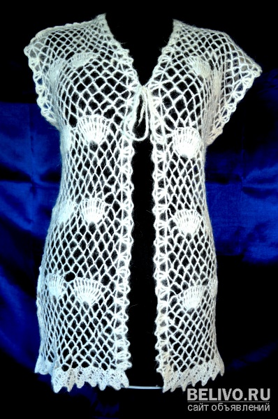 Жилет связан крючком, из натурального оренбургского козьего пуха, с добавлением основы шелковой нити.Состав: Козий пух 85% шелк 15%. Размер 46-48. Пуховый жилет прекрасно сочетается, с любым видом одежды, и нарядами.Он подойдет под любой сезон и погоду.В жаркое время воздушное кружево свободно пропускает воздух, а в холод козий пух сохранит тепло вашего тела.