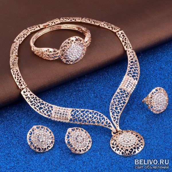 Цвет: золотистый, стиль: классический, тип изделия: ювелирный набор, материал: кристалл, пол: для женщин, тип металла: цинковый сплав, состояние: новое. В комплекте: Ожерелье, серьги, браслет, кольцо