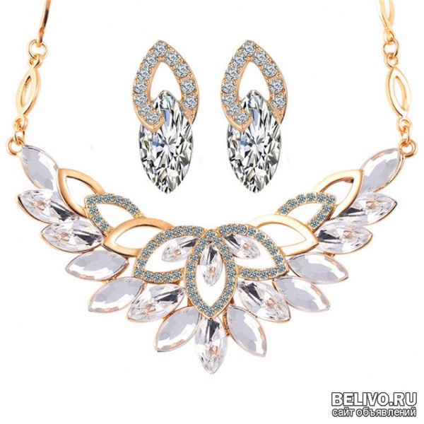 Материал: кристалл, стиль: модный, пол: для женщин. Тип изделия: ювелирный набор, тип металла: цинковый сплав, состояние: новое. В комплекте: Ожерелье, серьги. Белого цвета