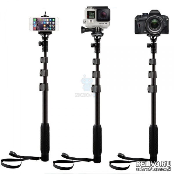 Продам телескопический монопод селфи палка длиной 425мм-1250мм с беспроводным подключением к смартфону, ID1288. Рады представить вам монопод для селфи ID-1288, который вы можете купить в нашем магазине. Этот монопод можно смело назвать очень качественным, универсальным и красивым устройством, отвечающим всем современным веяниям. Съемный держатель с зеркальцем, имеет вращающуюся крепежную область до 180 градусов, (удобно для изменения угла съемки), совместимый со всеми моделями смартфонов от разных производителей. Универсальность модели заключается в том, что сняв держатель, вы можете через простой переходник, с резьбой ¼, установить, практически, любой цифровой или зеркальный фотоаппарат, а так же action камеру для видеосъемки. Резьбовое отверстие в основании ручки, с помощью треноги, способно превратить селфи палку в устойчивый и элегантный штатив. А это очень удобно! Согласитесь. Селфи палка имеет вид черной телескопической основы, которая, в свою очередь состоит из трех разных по диаметру выдвигающихся трубок, имеющих пластмассовый фиксатор для контроля длины. В сложенном состоянии длина составляет 425 мм, и может достигать 1250 мм в разложенном. Пластмассовые фиксаторы позволят вам без труда отрегулировать удобную для вас длину под ваши творческие изыски. Трубки сделаны из алюминия, а ручка имеет прорезиненную основу, что вносит достаточный комфорт и легкость при ведении съемки. Идущая в комплекте петлеобразная тесемочка из ткани предохранит от случайного выскальзывания монопода из руки