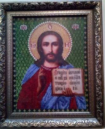 Икона Иисус Христос на зеленом фоне, вышивка бисером. Размер 25х20 см.