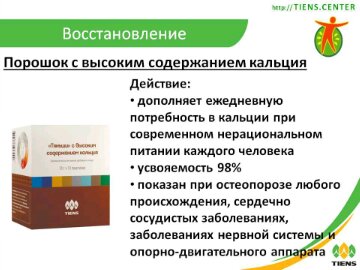 Кальций ТЯНЬШИ пополняет ежедневную потребность в кальции при современном нерациональном питании человека. Показан при остеопорозе любого происхождения, при диабете и болезнях щитовидной железы, сердечно-сосудистых заболеваниях, в том числе атеросклерозе, и онкологических заболеваниях, заболеваниях нервной системы и опорно-двигательного аппарата, для профилактики кариеса. Показания к применению при профилактике заболеваний и в качестве общеоздоровительных средств