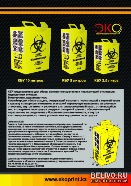 Коробка (контейнер) Безопасной утилизации (КБУ) для медицинских учреждений от производителя. Описание: картон толщиной 1,2 мм, 0,53 мм, объемом 2,5л, 5л,10 л, микрогофракартон, класс Б.