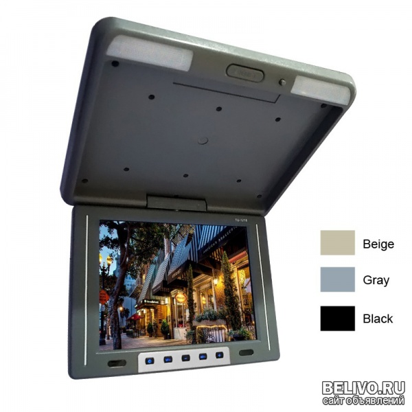Продам 12,1" Дюймовый потолочный автомобильный монитор + 2 видеовхода + ИК модуль для ИК наушников + пульт ДУ, ID12100. Новинка - потолочный автомобильный монитор с диагональю экрана 12.1" дюйма. Монитор представляет из себя удобный, тонкий потолочный модуль с ниспадающим экраном. На экране монитора кнопки управления, Инфра Красный аудио передатчик для ИК наушников, ИК датчик пульта ДУ. Инфракрасные наушники на нашем рынке найти довольно трудно, зато на китайских сайтах их полно. Преимуществ здесь, пожалуй, только два - 1- отсутствие проводов, 2 - инфракрасный модуль передает аудио сигнал с горизонтальным углом 90 градусов и все наушники, попадающие в этот угол, будут получать и проигрывать этот сигнал. На потолочном корпусе автомобильного монитора имеется подсветка. В случае, если при установке потолочного монитора Вам придется пожертвовать штатной потолочной подсветкой - не беда, подсветка потолочного монитора заменит ее. Потолочный монитор имеет два видео входа, переключаться между ними можно с кнопок управления на мониторе, либо с пульта ДУ. Удобной и приятной особенностью потолочного монитора является экран, который способен разворачивается на 90 градусов в вертикальной плоскости. Данный потолочный монитор не имеет собственных DVD, USB модулей, подключается к штатной аудио/видео системе. Звук так же передается через штатную аудиосистему. Потолочный монитор отвечает только за вывод видео. В нашем интернет – магазине вы можете приобрести потолочный автомобильный монитор в черном, сером или бежевом цвете..