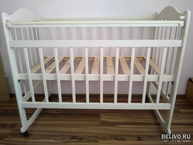 Десткая кроватка в белом цвете в отличном состоянии, без матраца, на колесиках. По внутренним сторонам имеются защитные вкладки.