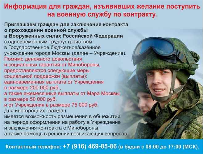 Приглашаем мужчин для прохождения военной службы по контракту с Минобороны РФ с одновременным трудоустройством в бюджетную организацию города Москвы.